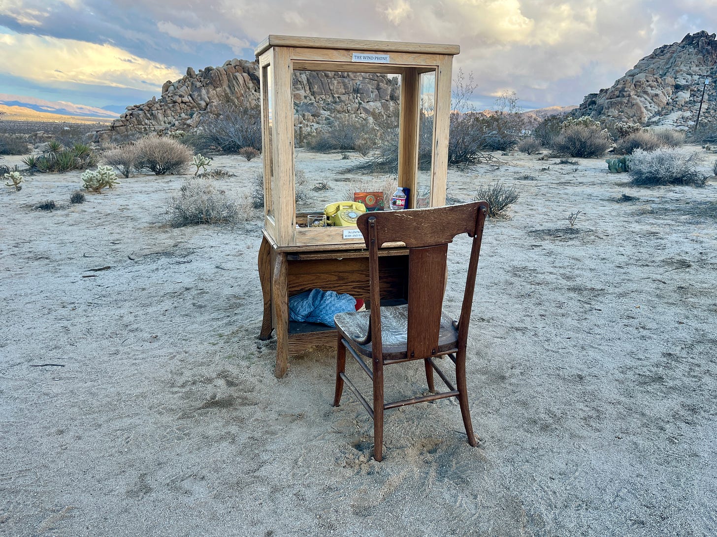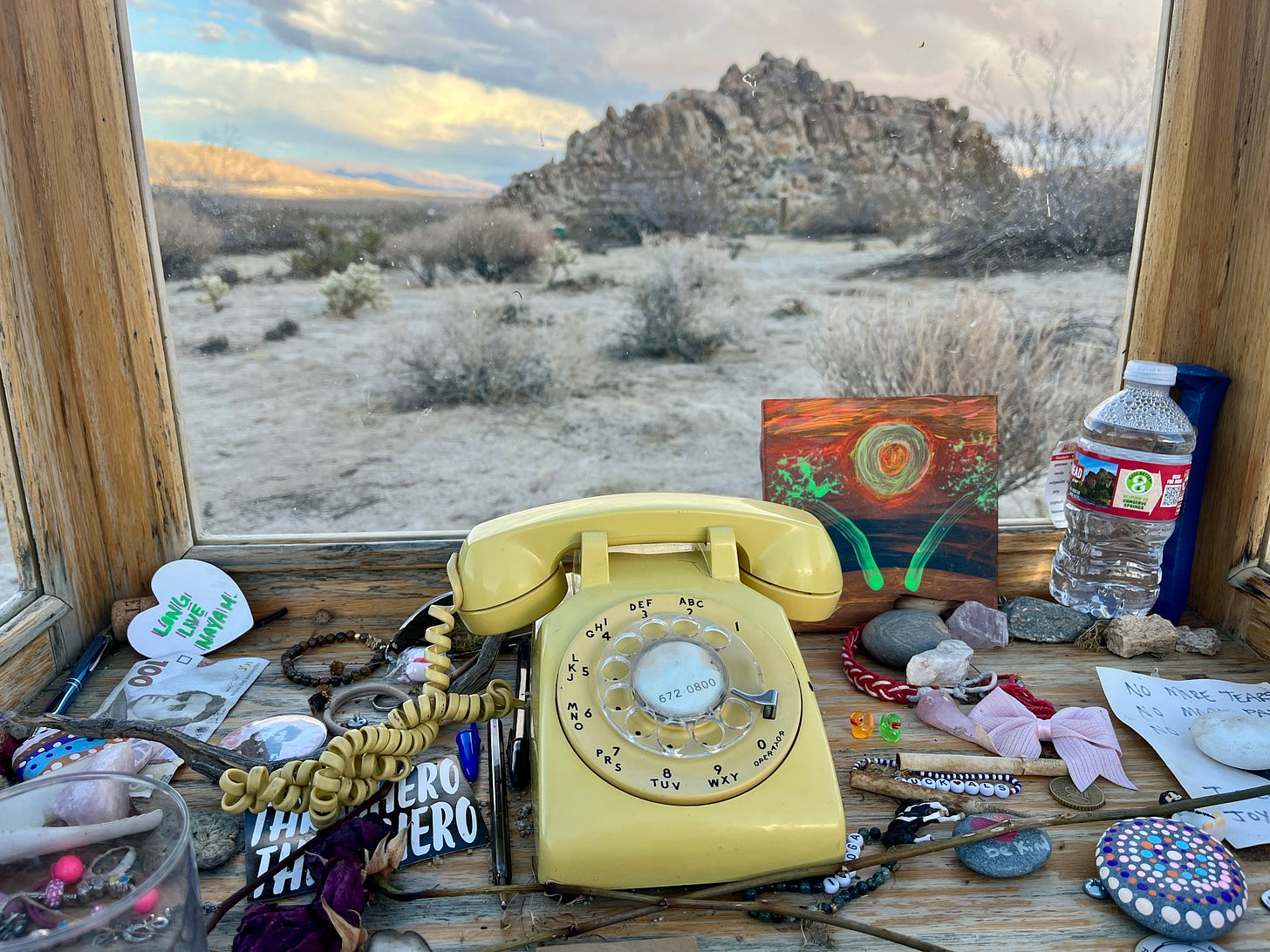 Last week I took a quick drive down the 62 to visit the Campbell Wind Phone in Joshua Tree. Created by locals Colin Campbell and Gail Lerner in dedication to their children, Ruby and Hart, who were killed in a drunk driving accident in 2019, the Campbell Wind Phone sits waiting for anyone who needs to make a phone call to a loved one who is no longer with us. “We miss and talk about them every day,” reads their website. “We talk to them as well, but there are days when they feel so far away it’s hard to imagine our words reaching them.” Inspired by the original wind phone, assembled in Japan by Itaru Sasaki who, while grieving his cousin, bought an old fashioned phone booth, installed it in his garden, and placed in it a broken rotary phone with no wired connection. Sasaki called it Kaze No Denwa (風の電話), or Wind Phone.